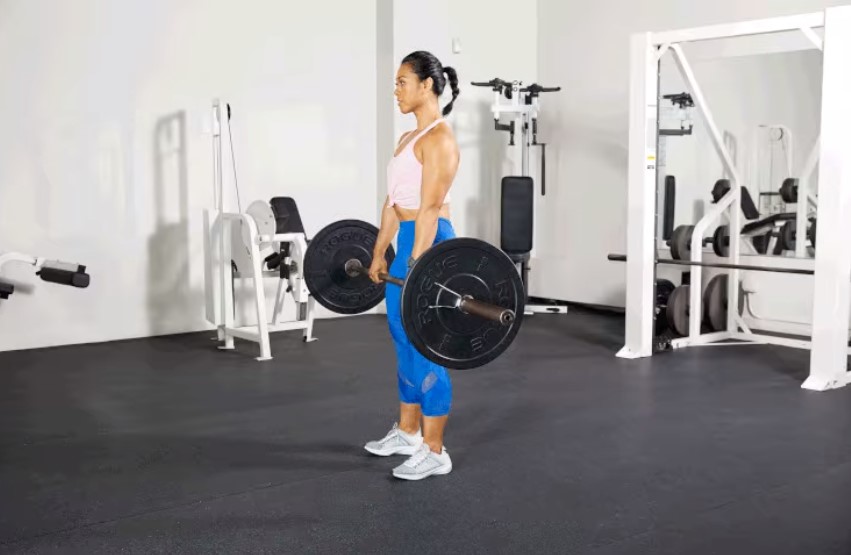 6. The bar should almost graze the shins and rest around the thighs as you reach full height. Without leaning over, as much as you can, pull your shoulders back.